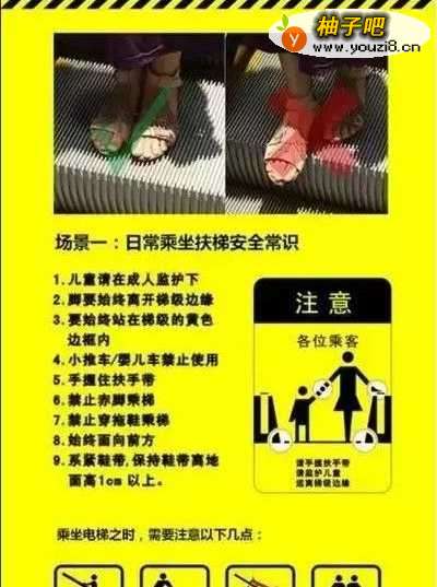 ①不能踩在黄色安全预警线以及两个梯级相间的部分,以免脚被卷入缝隙里头