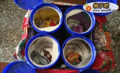 宝宝吃的奶粉罐不要扔了,留着很多用处,小编就用奶粉罐给宝宝做了一个凳子,而且还能收纳玩具。
