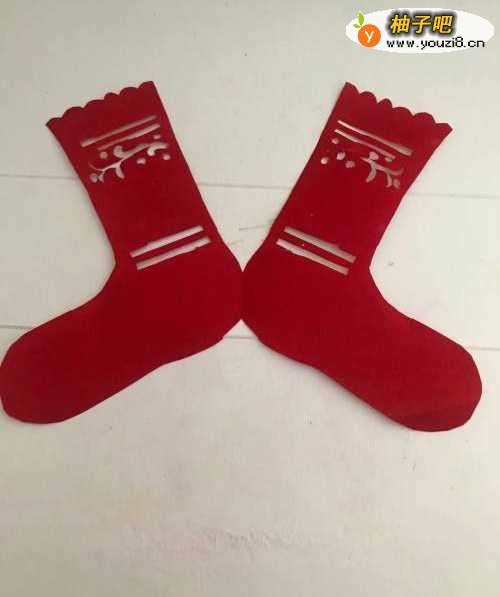 6第六步 剪完外围多余的彩纸之后 再剪袜子的细节部分和花纹部分 然后再剪其它涂实的部分等等 剪完之后 展开压平 一双漂亮的长筒袜子就裁剪完成了