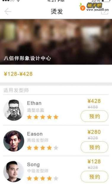 6你还能了解到美美发旗下的发型屋所提供的美发服务详情,例如:烫发,会在一定的收费范围内为你推荐各个发型师供你挑选。