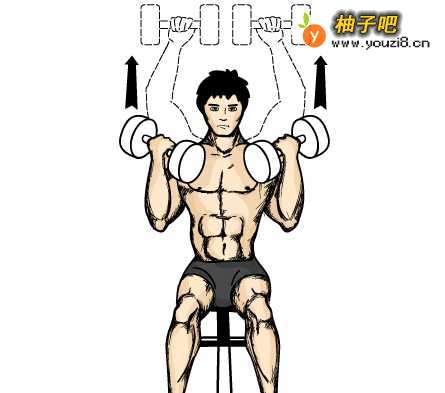 然后类似哑铃推举动作上举,并开始旋转手腕,以使哑铃举到最高点时,掌心朝前;