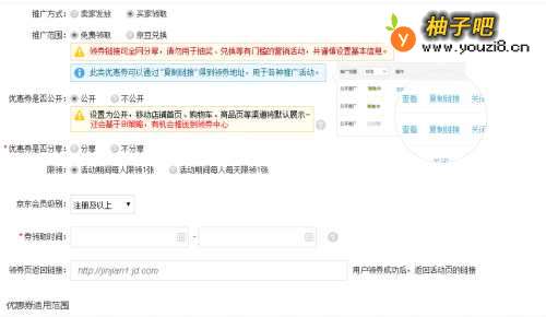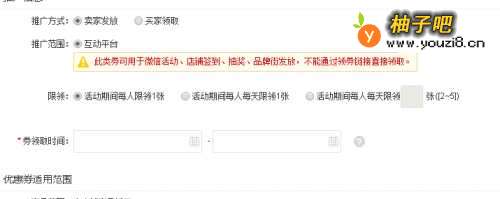 5接下来是配置推广信息。依次配置推广方式(买家领取和卖家发放两种可选),如果是卖家发放方式,后面配置限领类型和领取时间即可。然后点击【提交】按钮即配置完成。