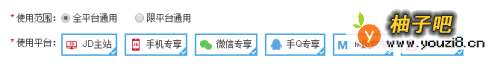 4这里报告一下,使用范围能选择全平台或者限平台通用,如果不选择全平台通用,将无法被京东手机端店铺首页自动抓取到,但是不影响购物车,商品页等渠道默认展示。