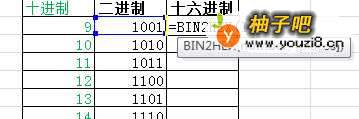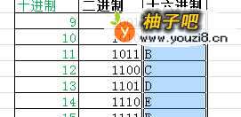 5点击十六进制的9,光标放在单元格右下角变成+时,拖动它至所需要的单元格,即可批量复制该公式,最终显示二进制1001~10000的十六进制转换结果9~A,均对应十进制的9~16,如下图所示。