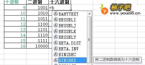 2在八进制下面的第一个单元格输入“=B”,在弹出列表中找到BIN2HEX函数,函数后面会有汉字报告,确保正确。双击它,使之填充到“=”后面。