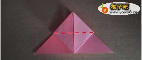 7把背面也用第三步到第五步的方式折叠,我们就能得到下面第一幅图所示的形状。然后沿着第二幅图所示虚线,把中间的两个小三角形往两边折叠(注意前后两面都要这样处理)。