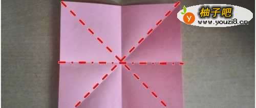 首先,拿一张正方形的纸,并且上下左右以及对角线对折,折出折痕。
