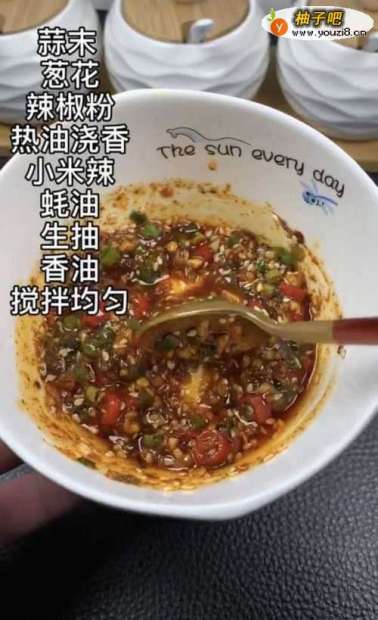 6再调个料汁:葱蒜末、辣椒粉,热油浇香,小米辣、耗油、生抽、香油,搅拌均匀