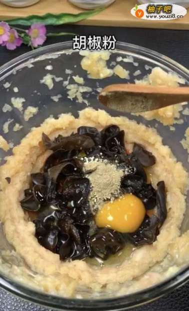 2放入爱吃的蔬菜丁、木耳、一个鸡蛋,生抽、耗油、盐、鸡精、胡椒粉,