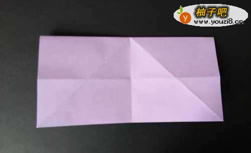 6再将下面的长方形部分对折,折好后将下面一层开启,再次沿左边和右边顶点向右向左折叠如图。