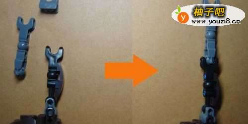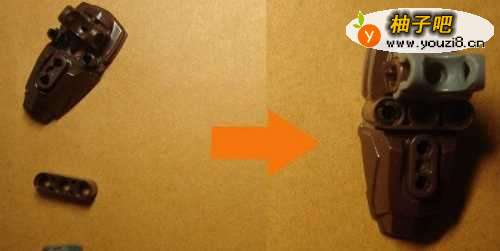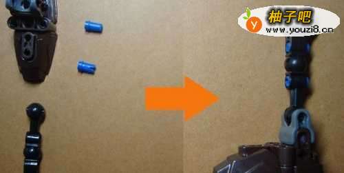 5接着,拼装人物模型腿脚的部分的连接支架轴部分。由两个连接支架轴积木和一个轴零件积木所组成。左边是拼装所需的零件,右边是拼装好后的整体结构效果,如下图所示。
