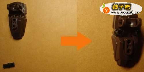 4然后,拼装人物模型腿脚的部分的腿支架部分。由一个腿主轴支架积木和一个轴零件积木所组成。左边是拼装所需的零件,右边是拼装好后的整体结构效果,如下图所示。