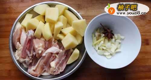 首先把土豆切块、鸡肉切好、准备一个八角,蒜、姜适量,洋葱切片。