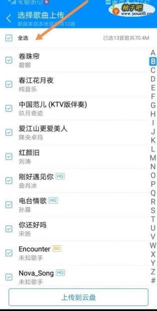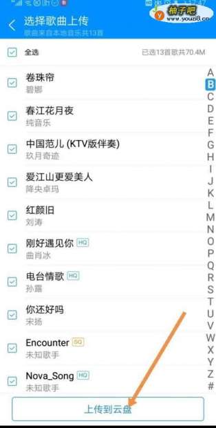 6选择完后点击上传到云盘。这样就能在不同的设备上登陆自己的帐号享受自己所有上传到云盘的歌曲了。