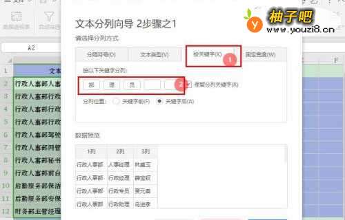 4在”文本分列向导2步骤之1“对话框,选择【按核心字】,并输入【核心字分列】,然后点击【下一步】;