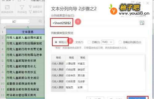 5在”文本分列向导2步骤之2“对话框,配置结果显示单元格【B2】,类型选择【常规】,然后点击【完成】。