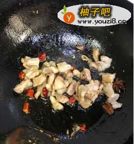 冷油下五花肉、干辣椒、八角、桂皮煸炒至肉变色。