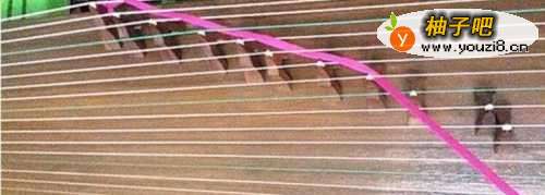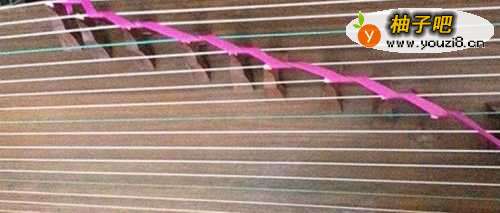 用一根鞋带或布条之类,如果是用布条的话,最好选择一弹性的,我们平常穿线的鞋带也选择有些弹性的。这样能不至于琴弦弹奏的生板。把鞋带一头绑在21弦的筝码上