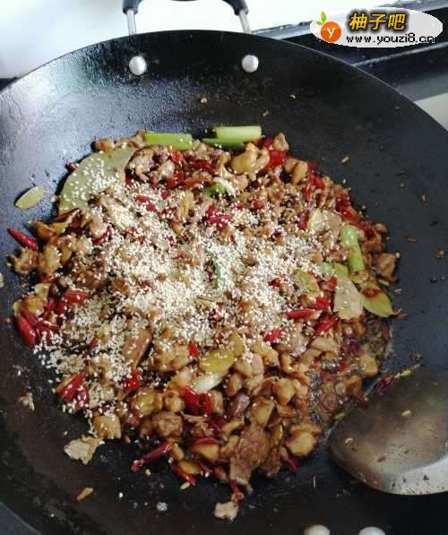 8第八步,接着能关火了,加入半袋熟白芝麻,翻炒均匀起锅。超级简单而且美味的正宗冷吃兔就做好了。