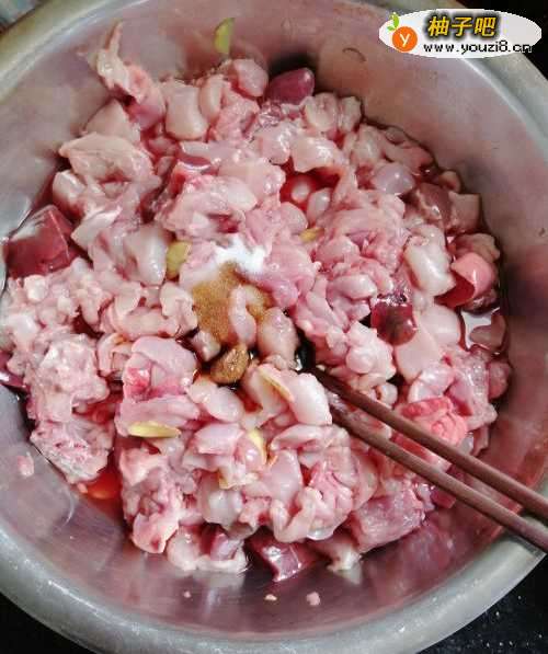 3第三步,把兔子切成小块,加入一勺生抽和一勺料酒,适量的食盐搅拌均匀,腌制大概半个小时。