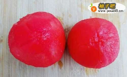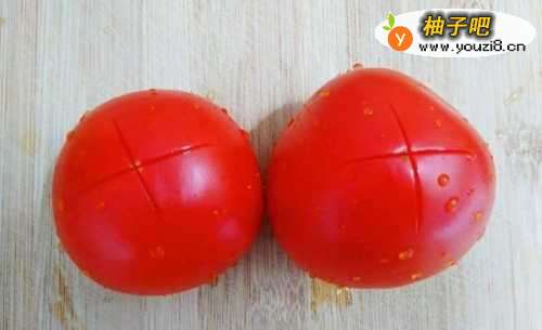 2下面来处理食材。先把西红柿去蒂洗净,在顶部用刀割一个大大的“十”字,然后蚂伐泥放在盆里,浇上热水在盆里泡1分钟。(这样一会儿就能很轻松的把西红柿皮剥掉了)