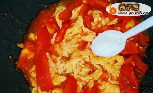 8放入刚才炒好的鸡蛋,翻炒两下,调入2克食盐和白砂糖再翻炒30秒。