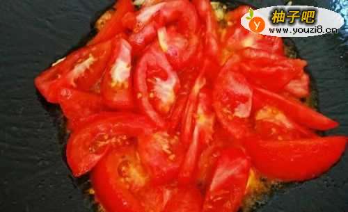 7热锅倒油,放入蒜末爆香后,倒入西红柿翻炒,并时不时用铲子背面在西红柿上轻轻压段海一畜舍压,能使西红柿里的汁更好的释放出来。