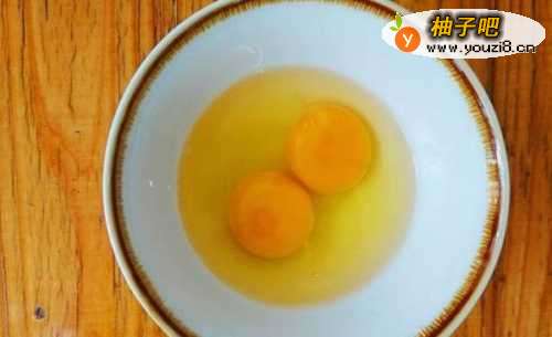 4鸡蛋磕碎在碗里搅散,然后放一小捏盐和一汤匙清水搅拌均匀待用。