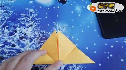 3把彩纸翻到另一面同样实施,把内侧的两个角向外折,后边的一样实施。