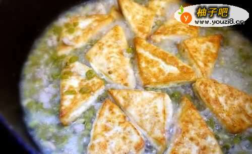 5加入豆腐和一碗水(高汤)适量酱油(蚝油)、鸡精盖锅盖焖一两分钟,最后下生粉水勾芡。酸豆角很咸啊,要不要酱油或蚝油你自己看。