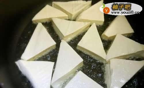 2豆腐切成你喜欢的形状,下锅煎(油比日常炒菜多点)。