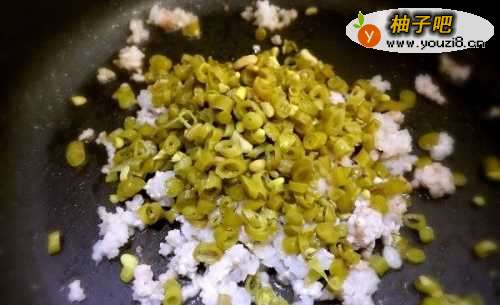 4刚才的锅继续放入猪肉末和酸豆角翻炒,炒多久呢,重点是把猪肉炒熟,酸豆角炒掉些水分,就好。如果你喜欢吃辣,此时加入辣酱一起炒。