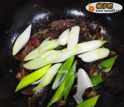 6放入大葱和黑木耳一起翻炒几下,加入少许清水,让辣椒和腊肉煮得更为入味。