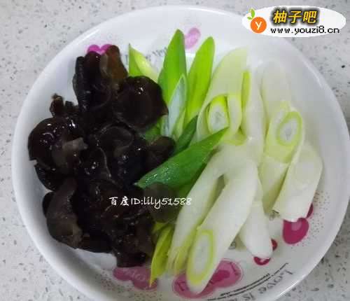 2黑木耳泡发好洗干净,大葱去根,切成斜段备用。