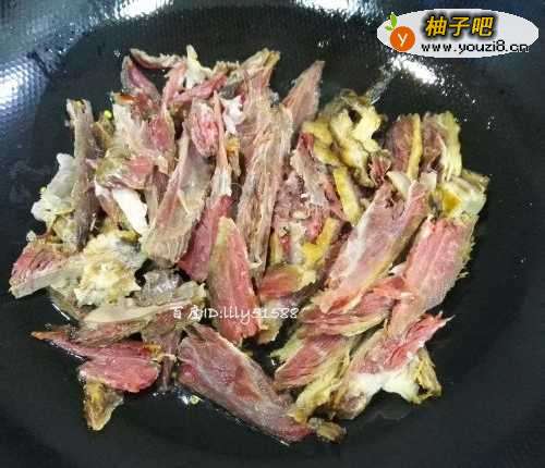 5放入腊肉,大火翻炒几下。腊肉是已经煮过了,小心翻炒容易碎掉。