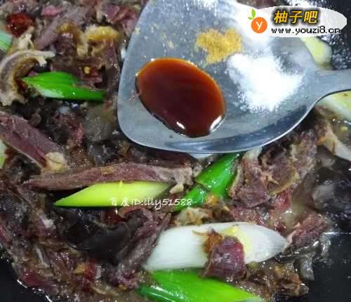 7放入少许蚝油、盐、十三香翻炒入味。