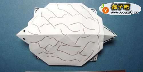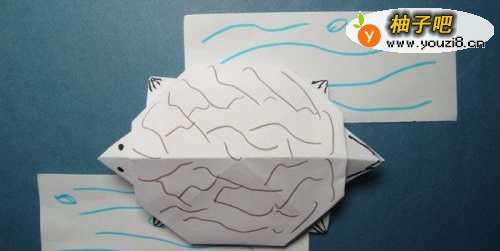 7最后,用蓝色彩色笔在裁出的白纸边上,画出水纹和水珠的图形,放在折纸乌龟的下边。组成了游泳的乌龟的场景折纸了。