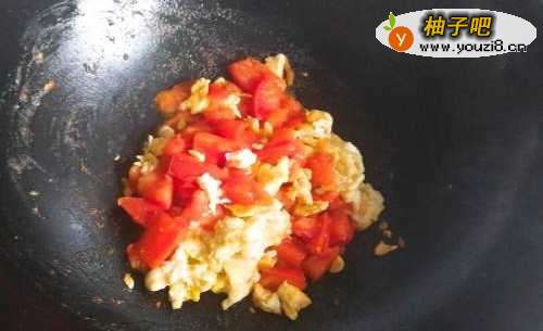 5再倒入准备好的西红柿丁,继续进行翻炒。