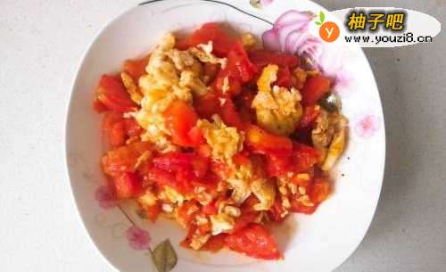6西红柿翻炒出汁后,再倒入之前盛出来的鸡蛋,,并根据个人口为佐以适量的调味品(如食盐、白糖、鸡精等)继续翻炒。