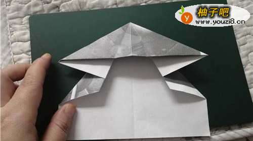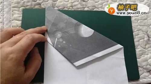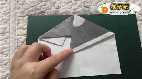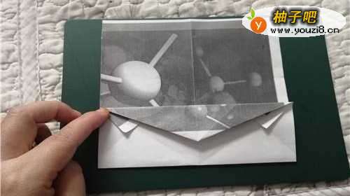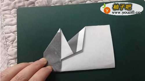 5左侧和右侧一样运作,如图一。把纸翻到背面,把下面的角上折,如图所示。
