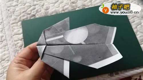 6然后把纸从中间对折,如图一。把上侧的部分向下折,另一侧的向后折,最后把尾翼处稍稍的上卷一下,图三是完成图。