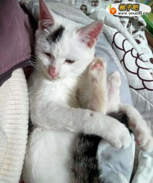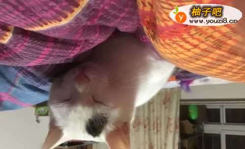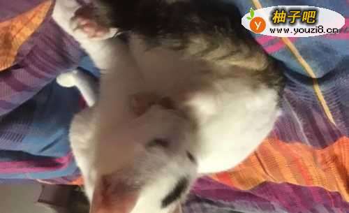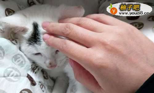 3抚摸猫咪的额头和下巴,尽量让她有安全感。