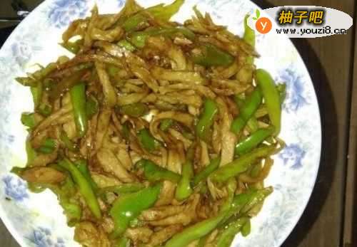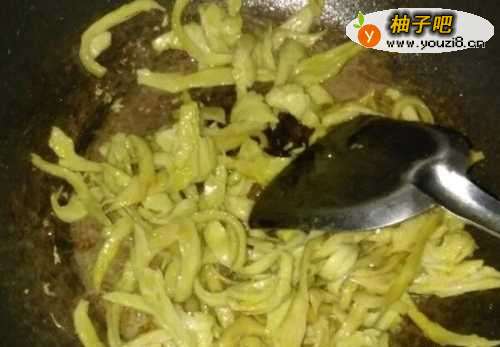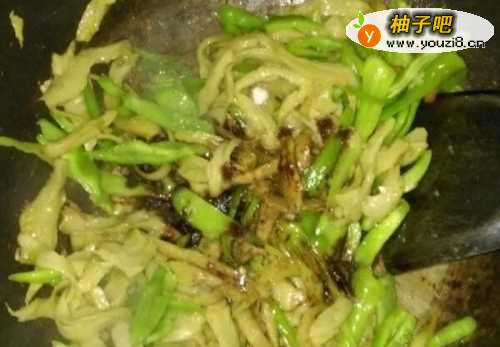 4在锅里倒入植物油,待油微热后,放入待用的面筋,在锅里翻炒,在面筋快要粘锅的时候,放入一干煸好的青椒一起进行翻炒。