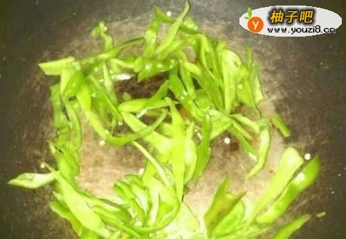 3开火,待锅微热的时候,将备用的青椒放在锅里干煸一下,待水分干的时候,盛在盆里备用,这样可去除部分青椒的辣味,不喜吃辣的朋友能按照这样的做法。