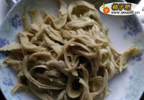 2将买回来的面筋用清水冲一下,然后顺着面筋的纹路撕成一条一条的,放在盘子里备用。青椒洗干净后用刀切成一块一块的也放在盆里备用。