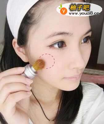 配置粉扑轻沾蜜粉,先在手上轻轻推匀、或用粉扑相互搓匀,再用按的方式,从两颊到额头慢慢轻压,确实将上粉底的部分都压上蜜粉即可。