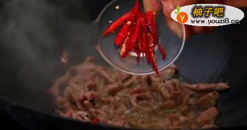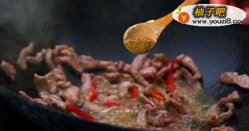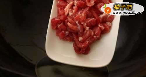 4起锅烧油,将准备好的肉丝放在锅中,进行翻炒。