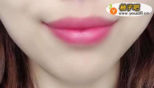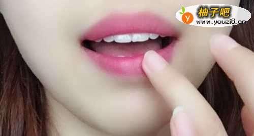 4用无名指指肚将口红慢慢的晕染到整个嘴唇,当然用棉签也能,我个人觉得指肚好用,晕染完很贴合,不会干裂起皮。