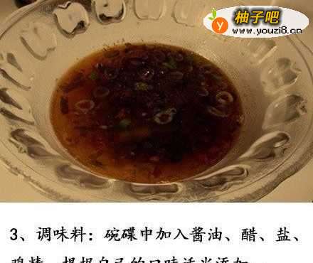 4制作调味料:碗碟中加入酱油,醋,盐,鸡精(根据自己的口味适当添加)