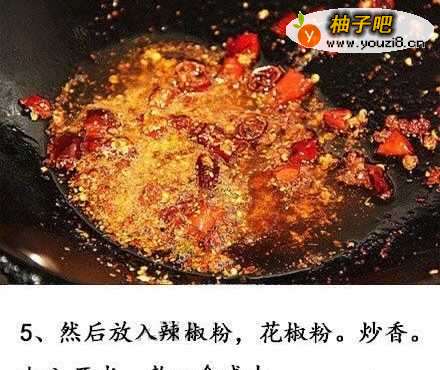 5锅中倒油,开小火,放入辣椒,花椒